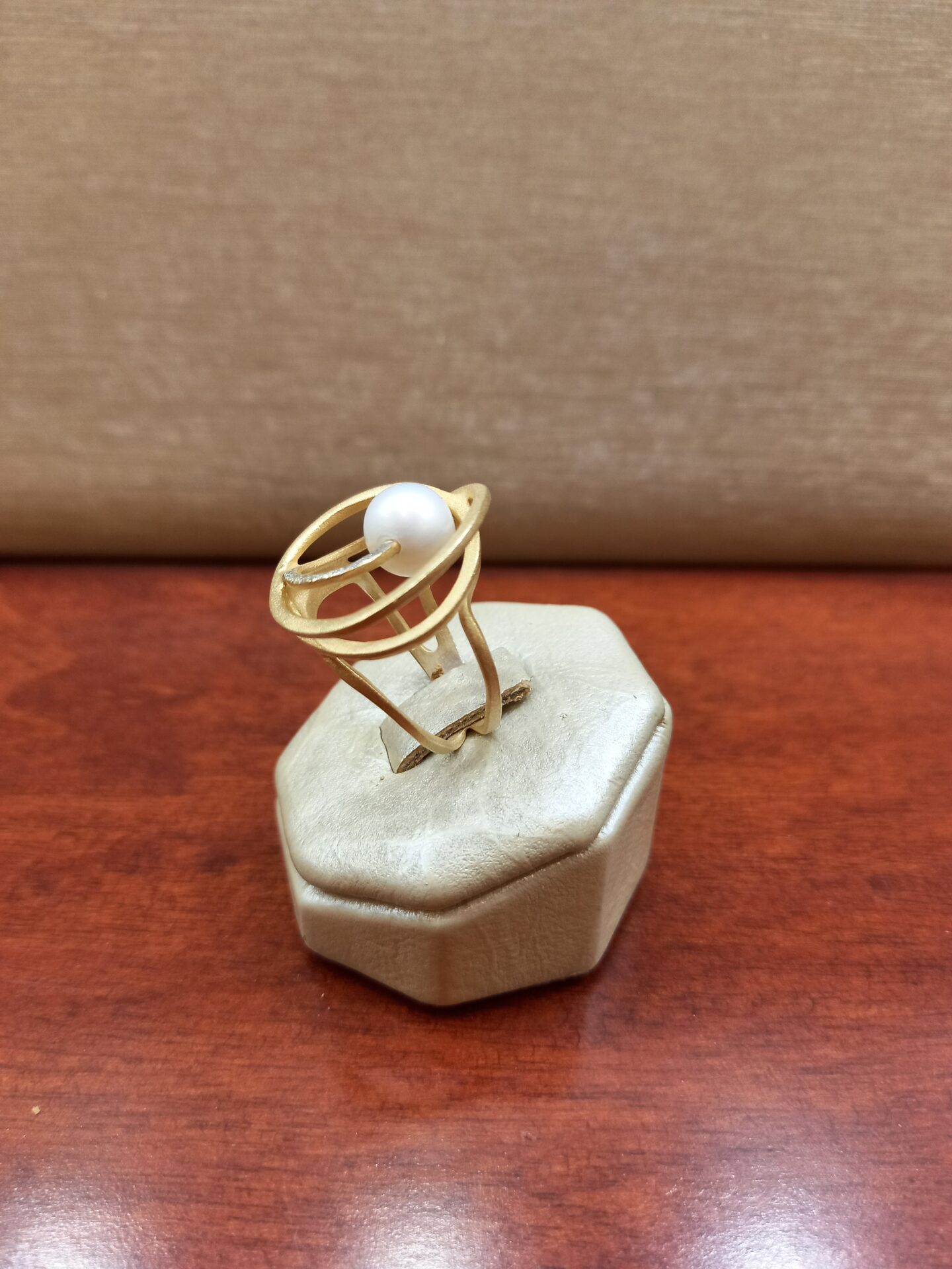 Ασημένιο γυναικείο χειροποίητο δαχτυλίδι 925`. Επιχρυσωμένο με 18κ κίτρινο χρυσό και διακοσμημένο στο κέντρο με λευκό χρυσό και ένα μαργαριτάρι. Μέγεθος δακτυλιδιού 56.