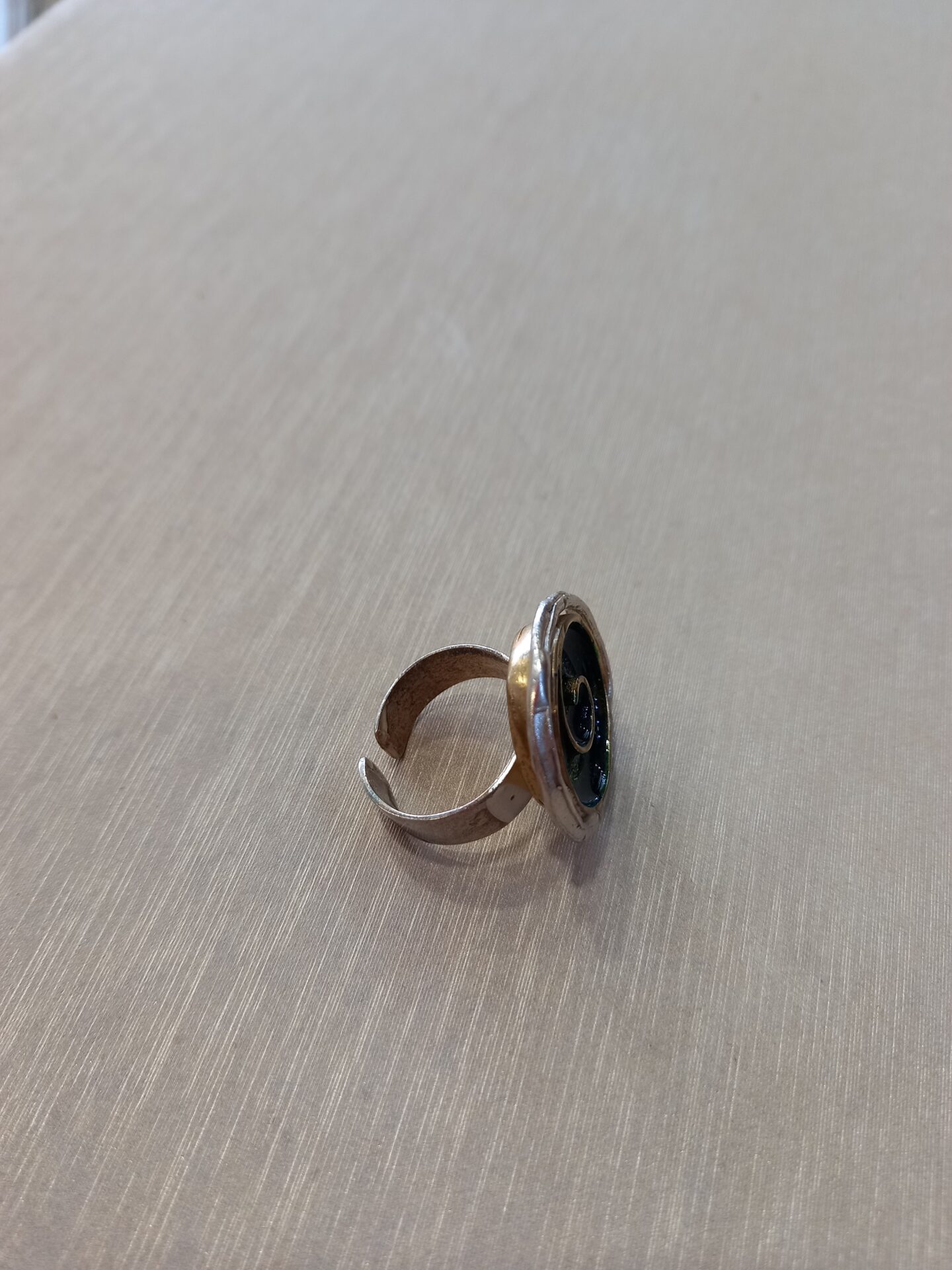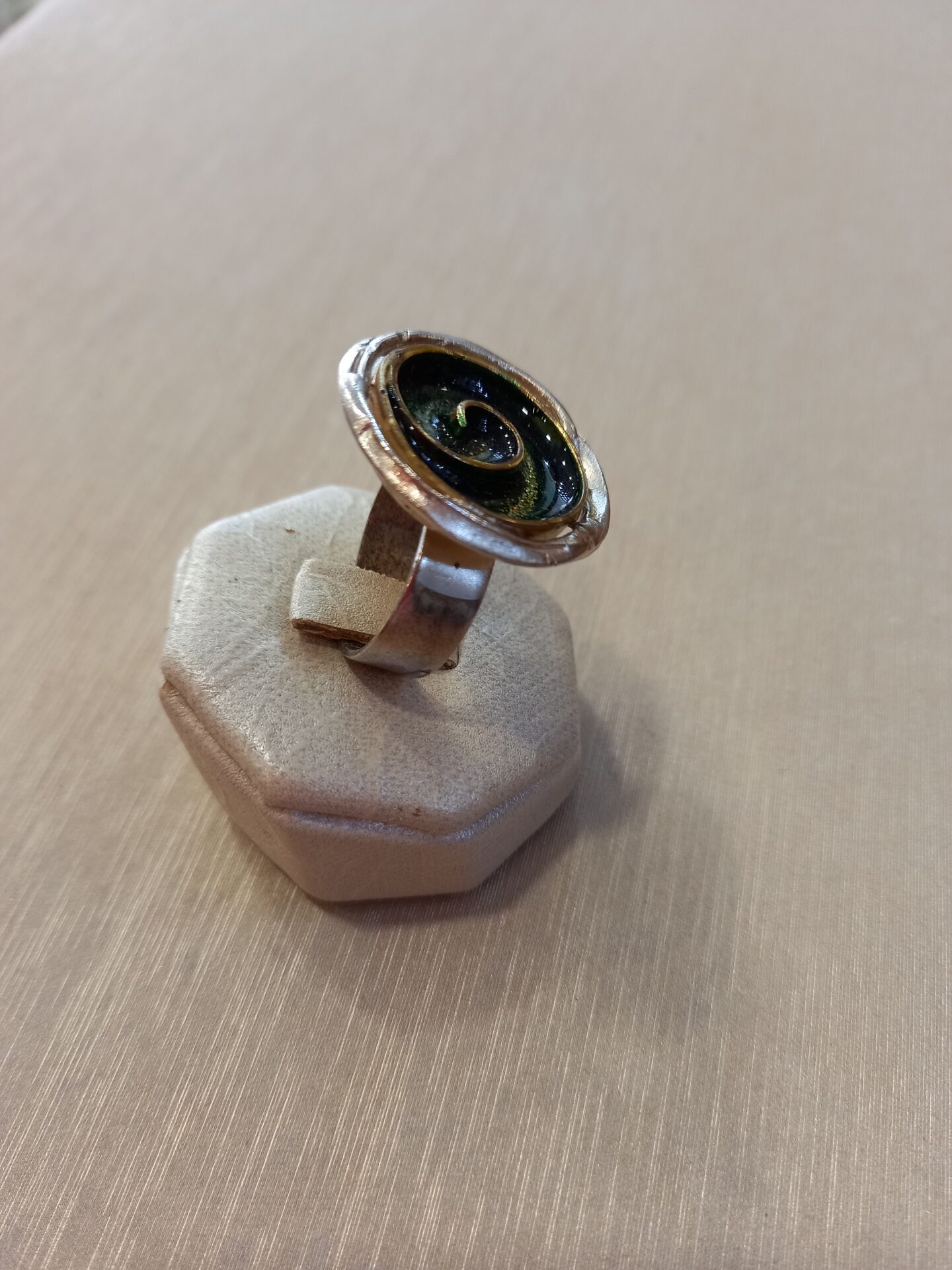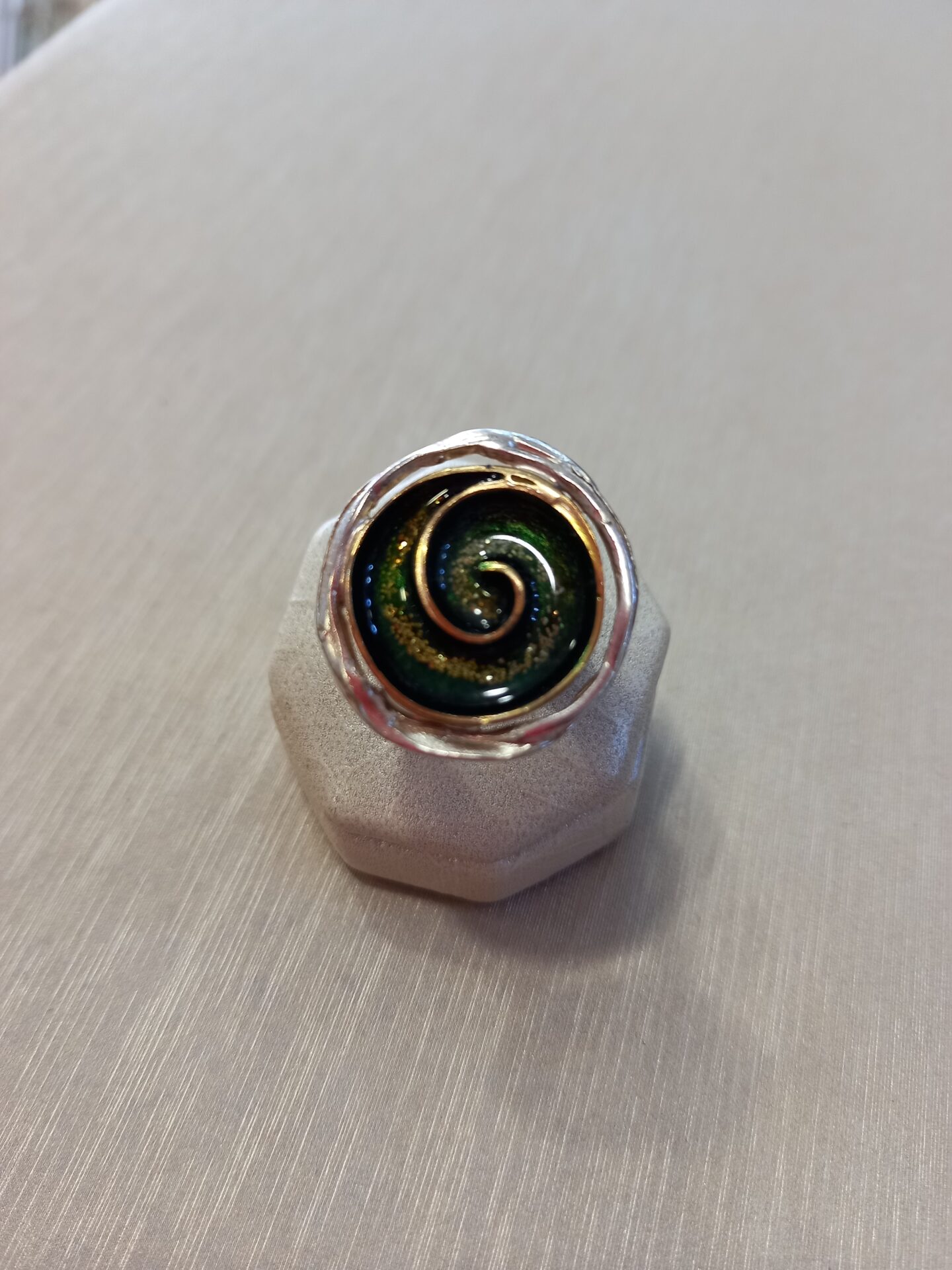 Ασημένιο χειροποίητο δακτυλίδι 925′ . Η σπείρα στο κέντρο του δακτυλιδιού είναι επιχρυσωμένη με 18κ χρυσό και έχει σμάλτο σε μπλε ή πράσινο χρώμα. Επίσης η γάμπα του δακτυλιδιού είναι ανοικτή έτσι ώστε να μπορεί να προσαρμοστεί σε οποιαδήποτε νούμερο.