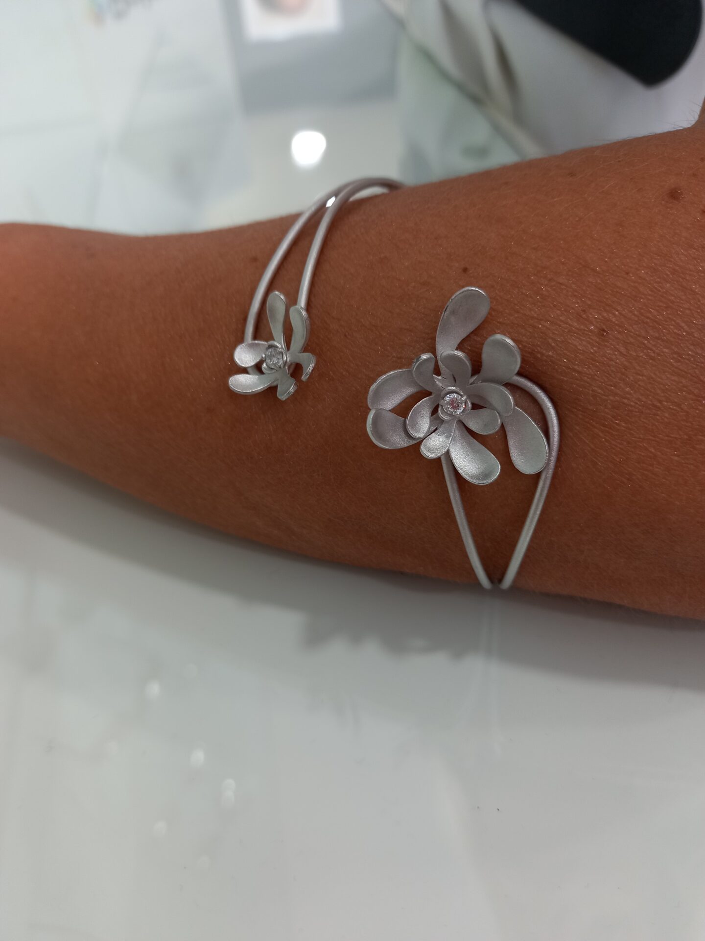 Ασημένιο χειροποίητο βραχιόλι 925` με δυο λουλούδια στο επάνω μέρος και μια πέτρα ζιργκόν στο κέντρο του κάθε λουλουδιού.